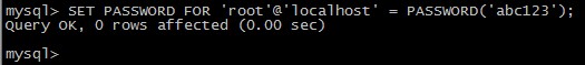 mysql> SET PASSWORD FOR 'root'@'localhost'=PASSWORD('abc123');