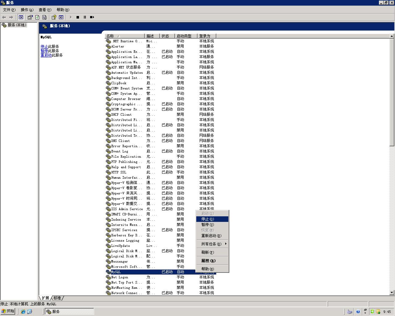 将名称为“MYSQL”的服务右键“停止”,如下图(图8)