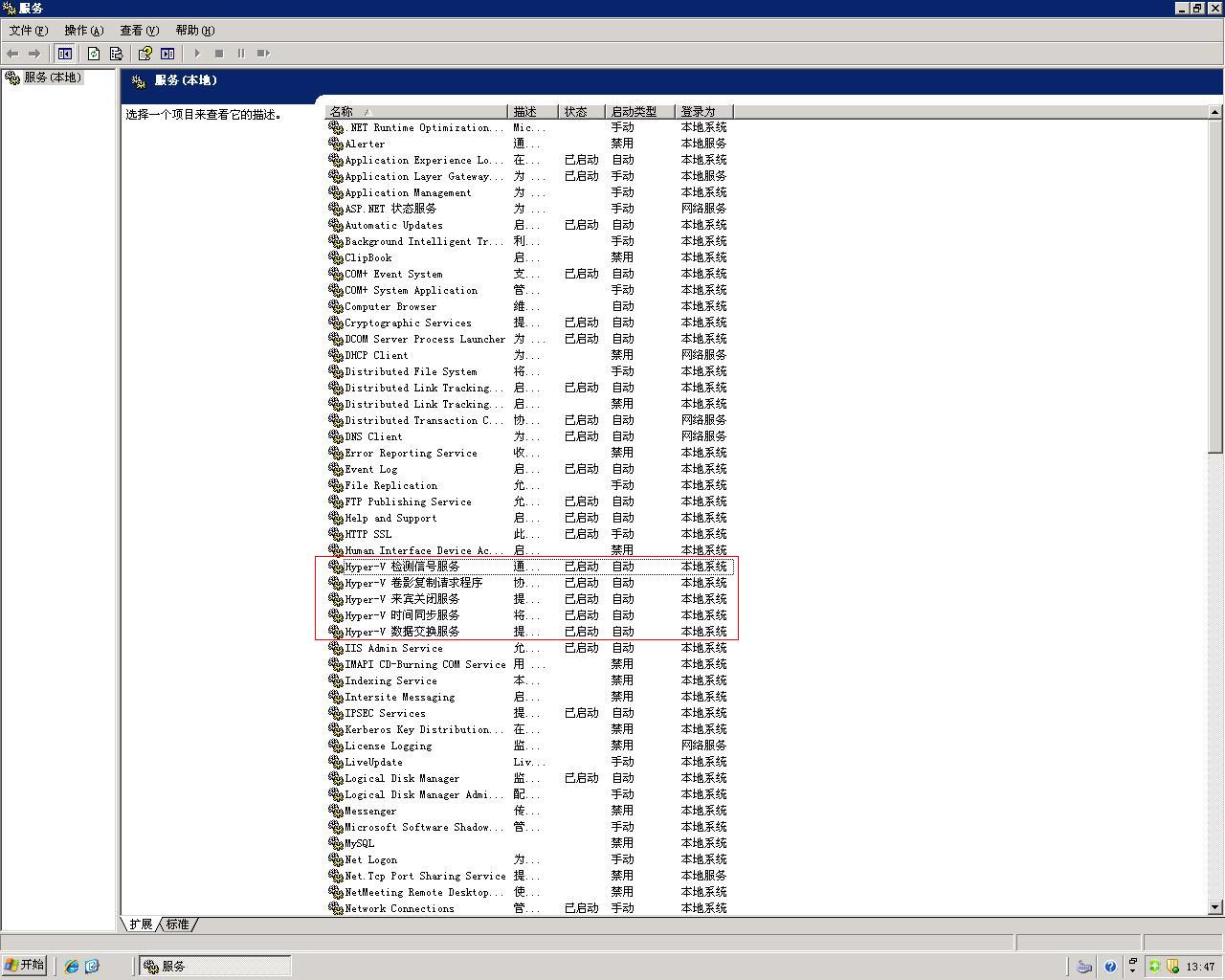 注意:在对服务停止操作时,有5项服务不要对其执行“停止”操作,一旦停止可能会给主机的正常运行造成影响,5项服务分别是Hyper-v检测信号服务、Hyper-v卷影复制请求程序、Hyper-v来宾关闭服务、Hyper-v时间同步服务、Hyper-v数据交换服务 如下图