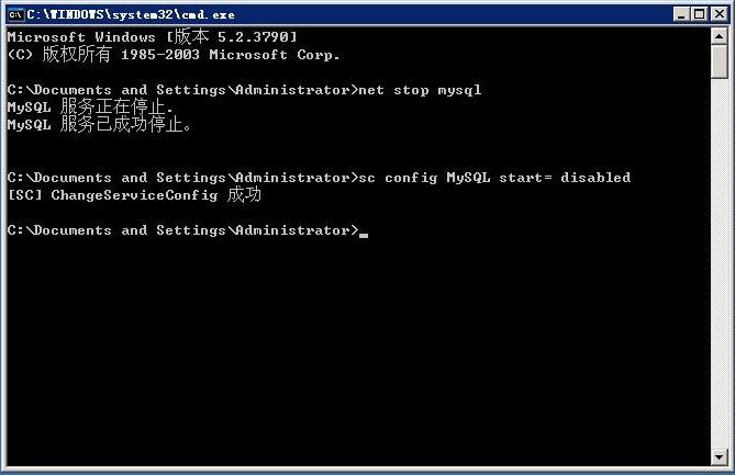 方法二:打开“开始”菜单→“运行”,在运行窗口的输入框里输入“cmd”,确定,在光标处输入“net stop mysql”回车,即停止MYSQL服务,在光标处输入“sc config MySQL start=disabled”回车,即将启动类型改为禁用,如下图(图11)