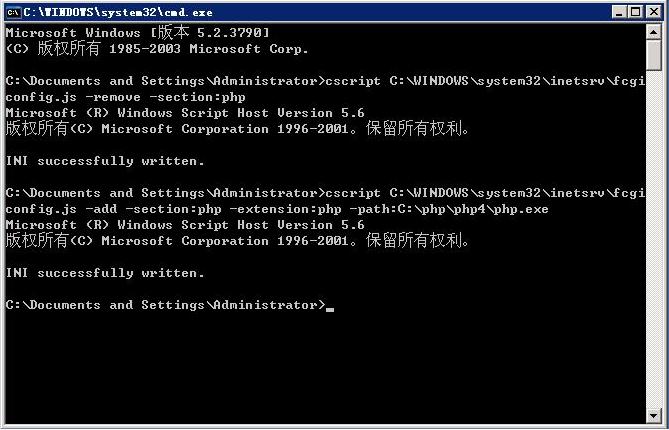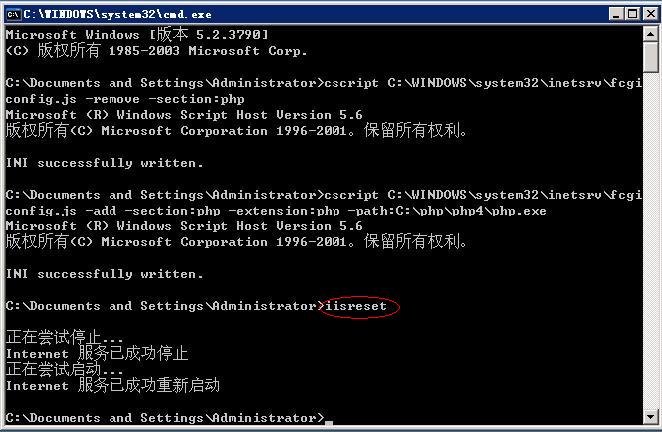 如果要从php4切换到php5,方法相同,指令有一点不同,步骤是:打开“开始”菜单→“运行”在运行窗口的输入框里输入“cmd”,确定,在光标出输入“cscript C:\WINDOWS\system32\inetsrv\fcgiconfig.js -remove -section:php”,并回车,即停止当前的php,再在光标处输入“cscript C:\WINDOWS\system32\inetsrv\fcgiconfig.js -add -section:php -extension:php -path:C:\php\php5\php-cgi.exe”,并回车,即运行了php5,最后在光标处输入“iisreset”,重启iis使其更改生效。