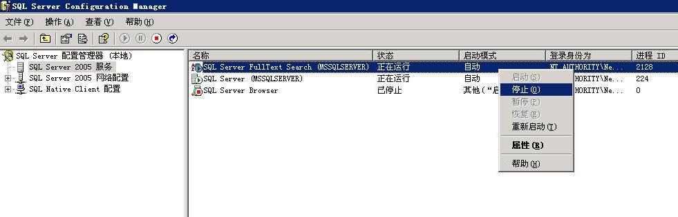选择“SQL Server 2005服务”,分别右键将“SQL Server FullText Search(MSSQLSERVER)”和“SQL Server (MSSQLSERVER)”服务选择“停止”,如下图(图2)