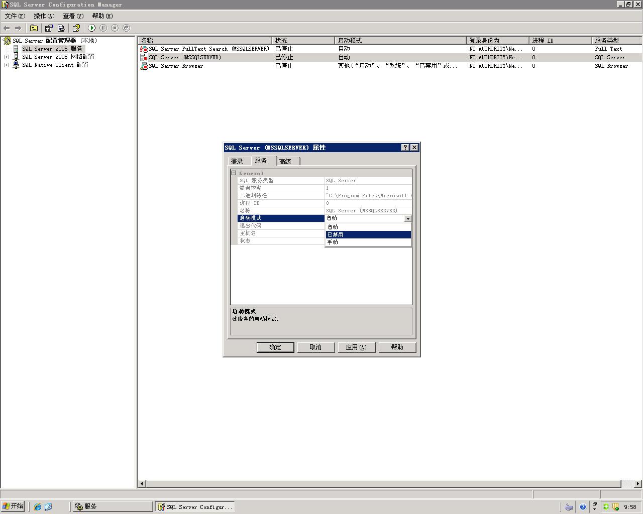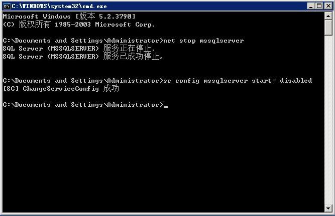 即将SQL Server (MSSQLSERVER)的启动模式禁用用同样的方法在光标处输入“net stop msftesql”和“sc config msftesql start=disabled”即可以把“SQL Server FullText Search(MSSQLSERVER)”的服务停止和启动模式禁用