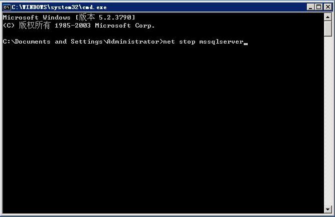 在光标出输入“net stop mssqlserver”,并回车 如下图(图5)