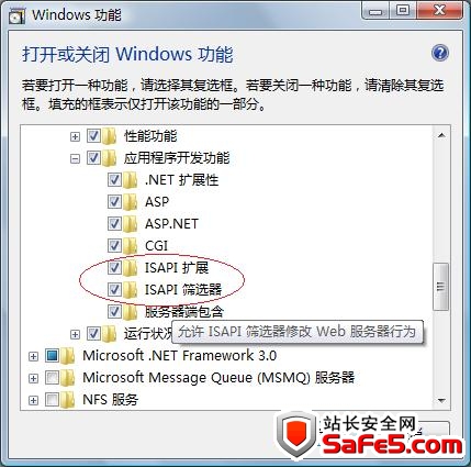 还要确认一点,在Vista的“打开或关闭Windows功能”里不但要安装IIS,而且还要安装两个重要的ISAPI组件,如下图: