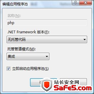4、打开Vista管理工具中的“Internet信息服务(IIS)管理器”,在“应用程序池”中新建一个应用程序池,取名为PHP,.Net版本为“无托管代码”。