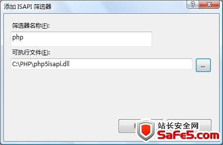 5、在“ISAPI筛选器”中点右键“添加”,起名为php,可执行文件选成C:\php\php5isapi.dll。