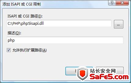 6、在“ISAPI和CGI限制”里点右键“添加”,路径还是选成c:\php\php5isapi.dll,描述还写成php,选中“允许执行扩展路径”。