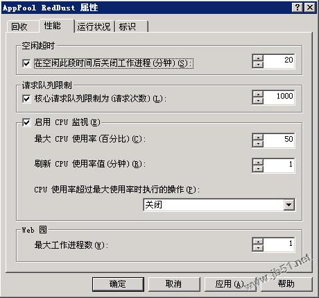 首先是对CPU的限制:在启用cpu监视后,我设置该应用程序池最大的cpu使用率为50%。设置刷新cpu时间为1分钟,设置操作为“关闭”。最大工作进程数设置为1。这个意思是,IIS刷新检测该独立池的CPU使用情况时间为1分钟,如果超过设置的cpu限制50%,就会发出关闭池的指令,要求池在指定的时间内关闭。如果池成功在这个时间内关闭,IIS会重启动一个新池,此段时间很短,一般不会有什么感觉,池就重新开启了,对于访问网站的人基本是不会有感觉的。但如果池没有在指定时间内关闭,IIS就会强行关闭它一个刷新CPU时间。在这个停止的时间内,网站无法访问,提示“Service Unavaliable”。