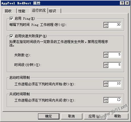 关闭时间和启动时间间隔设置:设短一些比如10秒,这样当您的网站程序大量占用系统资源时IIS自动快速回收进程并且快速启动进程,您的网站暂时还可以将就着工作。