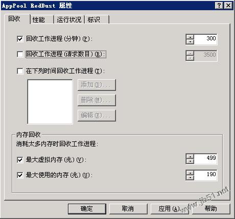 对内存的限制及进程回收时间的设置:我设置为内存占用超过800M就自动回收内存,虚拟内存没有做限制。进程回收时间我保持默认没有修改。各位可以根据自己的情况设置更短的时间。对应用程序池最大虚拟内存也可以在此进行设置,超过了设置的最大虚拟内存,该池会就被回收。