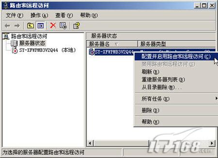 第一步:依次选择“开始”-“管理工具”-“路由和远程访问”,打开“路由和远程访问”服务窗口;再在窗口右边右击本地计算机名,选择“配置并启用路由和远程访问”,如下图所示: