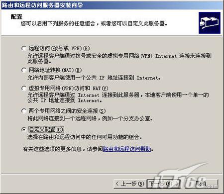 第二步:在出现的配置向导窗口点下一步,进入服务选择窗口,如下图所示。如果你的服务器如某此资料所说的那样只有一块网卡,那只能选择“自定义配置”;而标准VPN配置是需要两块网卡的,如果你服务器有两块网卡,则可有针对性的选择第一项或第三项。然后一路点击下一步,完成开启配置后即可开始VPN服务了。