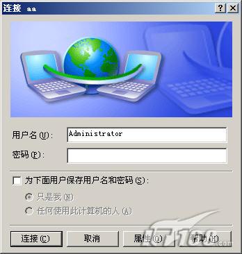 第二步:在“VPN服务器选择”窗口里,等待我们输入的是VPN服务端的固定内容,可以是固定IP,也可以是由花生壳软件解析出来的动态域名(此域名需要在提供花生壳软件的www.oray.net网站下载);接着出现的“可用连接”窗口保持“只是我使用”的默认选项;最后,为方便操作,可以勾选“在桌面上建立快捷方式”选项,单击完成即会先出现如下图所示的VPN连接窗口。输入访问VPN服务端合法帐户后的操作就跟XP下“远程桌面”功能一样了。连接成功后在右下角状态栏会有图标显示。
