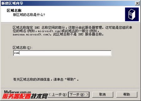 第2步,在“区域类型”选项卡中保持默认选项“主要区域”的选中状态,单击“下一步”按钮。接着在“区域名称”选项卡中输入合适的区域名称,如COM。依次单击“下一步”→“完成”按钮完成设置,如图2008121201所示。