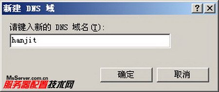 第3步,展开并选中刚才新建的COM区域,在打开的快捷菜单中执行“新建域”命令,打开“新建DNS域”对话框。在该对话框中输入一个合适的域名,如hanjit,并单击“确定”按钮,如图2008121202所示。