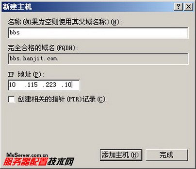 第4步,依次展开com区域→hanjit域,右键单击hanjit域,在打开的快捷菜单中执行“新建主机”命令,打开“新建主机”对话框。在“名称”编辑框中输入一个能反映该域名主要用途的主机名称,如FTP。在“IP地址”编辑框输入FTP服务器绑定的IP地址,如10.115.223.1,并依次单击“添加主机/确定”按钮,如图2008121203所示。