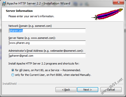 安装Apache: 双击安装,与安装其他Windows软件没有什么区别,在填Server Infomation时,并没有特殊规定,只要输入的信息符合格式即可。