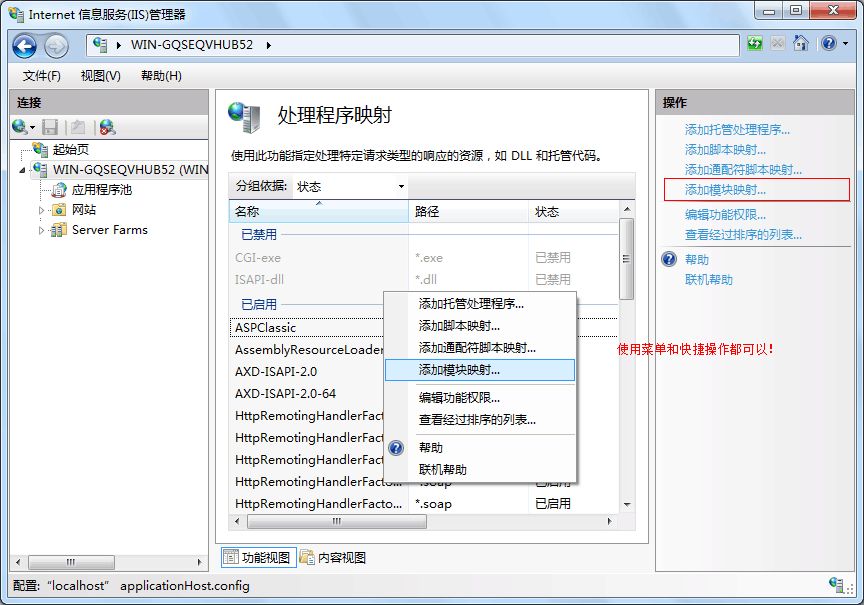 打开IIS管理器,找到:“处理程序映射”,打开如下图 点击 添加模块映射: