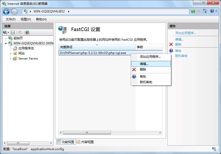 此时回到IIS功能视图,找到:“FastCgi设置”,打开并按图操作