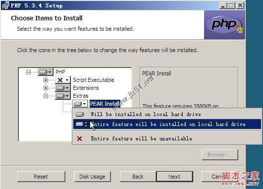 然后点击“next”按钮,到了选择安装选项的步骤,一般安装默认的就可以了,如果要添加的话需要点击一下前面的磁盘小图标,然后选择安装,第一项是只安装选中的项目,第二项是安装所有该项目的子项目。(图10)配置好后进入下一步