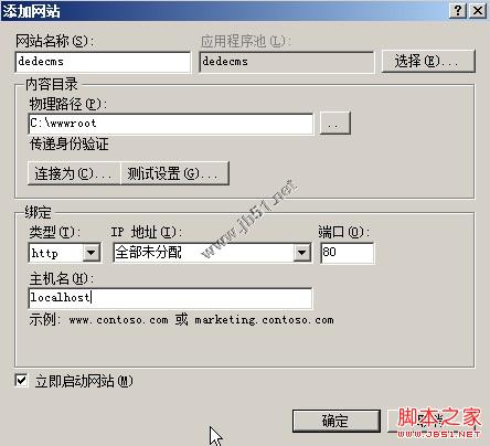 再新建一个网站,在“网站”上右击,点击添加网站,会出现信息网站添加的表单,首先输入网站名称,例如“dedecms”,路径选择为网站存放的路径,单IP的服务器可以不必选择IP,主机头填写为localhost,然后点击确定。
