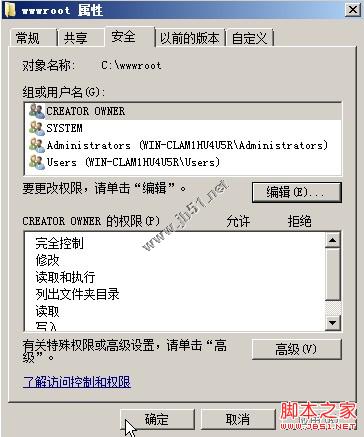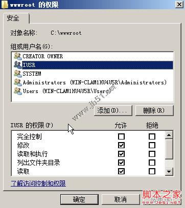 打开“编辑”窗口后点击“添加”按钮。添加一个“IUSR”到权限用户列表中,然后为其勾选除了“完全控制”之外的权限。然后点击“确定”。(图7)