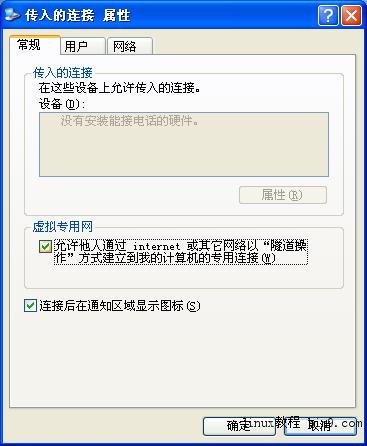 在“传入的连接 属性”的“常规”选项卡中,选中“允许他人通过 Internet 或其它网络以“隧道操作”方式建立到我的计算机的专用链接(W)”前面的复选框,如图所示: