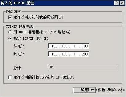如果VPN服务器所在的网络没有开启自动获取IP地址(DHCP),则需要配置传入连接的IP范围,双击“Internet 协议(TCP/IP)”,在弹出的窗口中选择“指定 TCP/IP 地址”,并填写与VPN服务器同一网段的空闲地址,推荐为双数。
