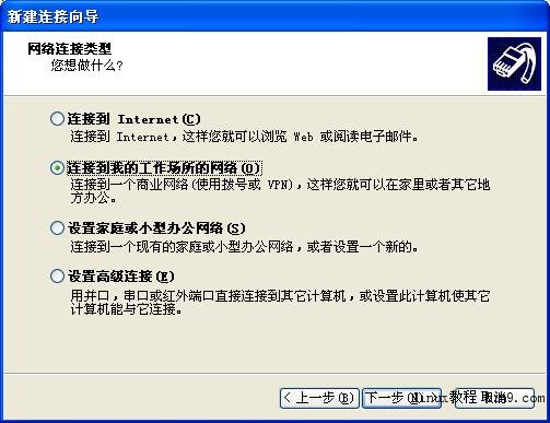 “网络连接类型”选择“连接到我的工作场所的网络”,点击“下一步”,如下图