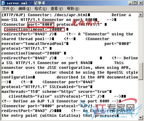 Tomcat的默认端口是8080,攻击者可以据此运行扫描工具进行端口扫描,从而获取部署了Tomcat的Web服务器然后实施攻击。因此,为了安全期间我们可以修改此默认端口。在Tomcat的安装路径的conf目录下找到server.xml文件,用记事本打开然后搜索8080找到对应的字段,然后将8080自行修改为另外的数字。另外,需要说明的是connectionTimeout="20000"是连接超时,maxThreads="150"是最大线程类似这样的参数也可以根据需要进行修改。(图8)