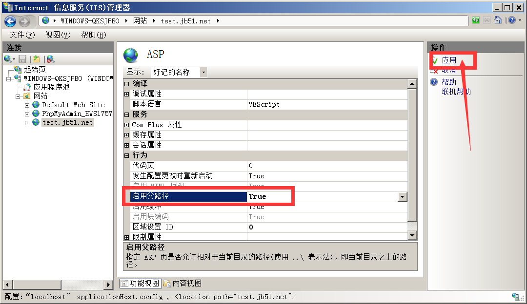 在IIS管理器中找到ASP图标,双击进去编辑,把启用父路径改为"true",然后点击右边的应用即可。