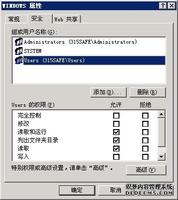 Windows目录要加上给users的默认权限,否则ASP和ASPX等应用程序就无法运行。以前有朋友单独设置Instsrv和temp等目录权限,其实没有这个必要的。