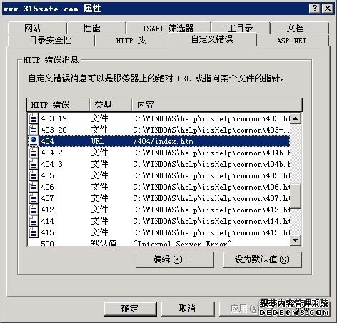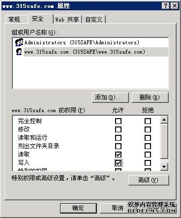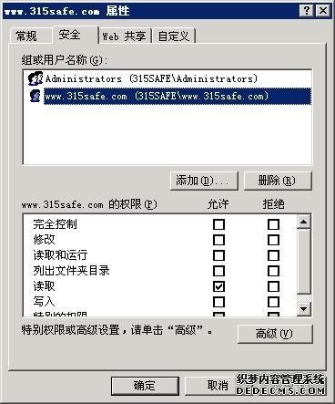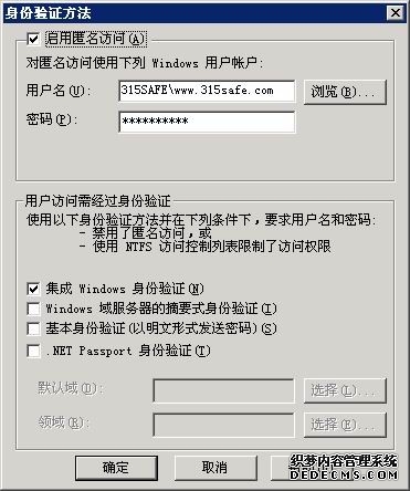 在IIS里的站点属性里"目录安全性"---"身份验证和访问控制"里设置匿名访问使用下列Windows 用户帐户"的用户名密码都使用www.315safe.com 这个用户的信息.在这个站点相对应的web目录文件,默认的只给IIS用户的读取和写入权限(后面有更BT的设置要介绍)。