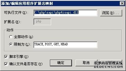 ASP,ASPX默认都提供映射支持了的,对于PHP,需要新添加响应的映射脚本,然后在web服务扩展将ASP,ASPX都设置为允许,对于php以及CGI的支持,需要新建web服务扩展,在扩展名(X):下输入 php ,再在要求的文件(E):里添加地址 C:/php/sapi/php4isapi.dll ,并勾选设置状态为允许(S)。然后点击确定,这样IIS就支持PHP了。支持CGI同样也是如此。