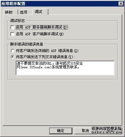 另外在应用程序配置里,设置调试为向客户端发送自定义的文本信息,这样能对于有ASP注入漏洞的站点,可以不反馈程序报错的信息,能够避免一定程度的攻击。