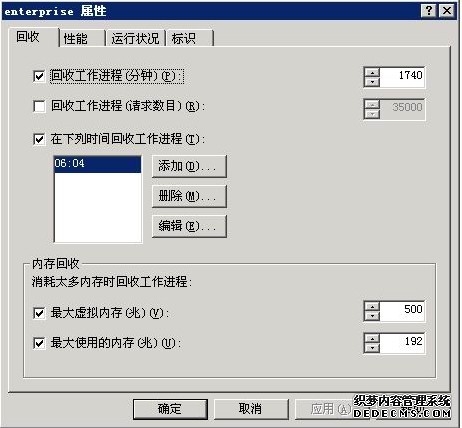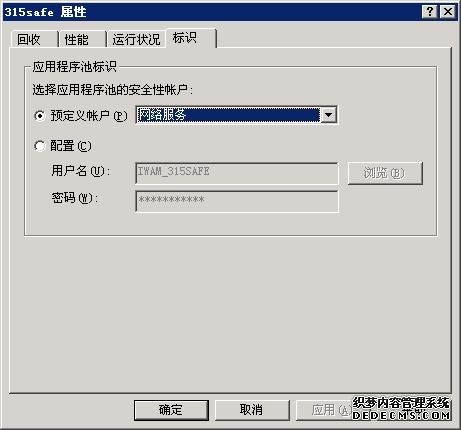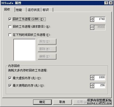 名为315safe的应用程序池可以适当设置下"内存回收":这里的最大虚拟内存为:1000M,最大使用的物理内存为256M,这样的设置几乎是没限制这个站点的性能的。