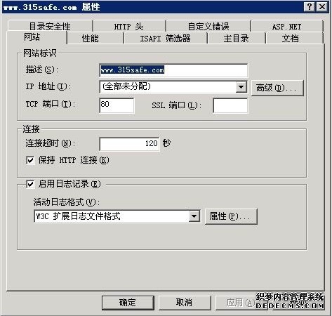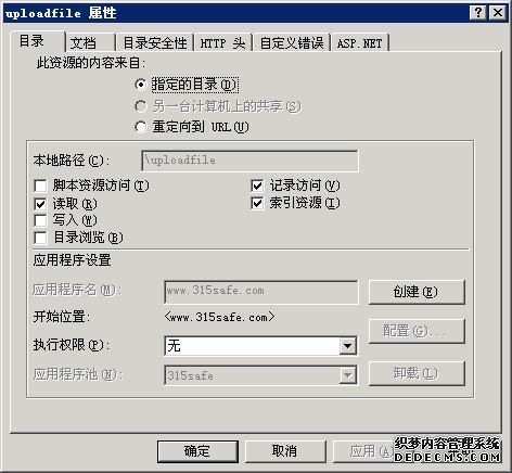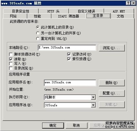 新建立一个站,采用默认向导,在设置中注意以下在应用程序设置里:执行权限为默认的纯脚本,应用程序池使用独立的名为:315safe的程序池。