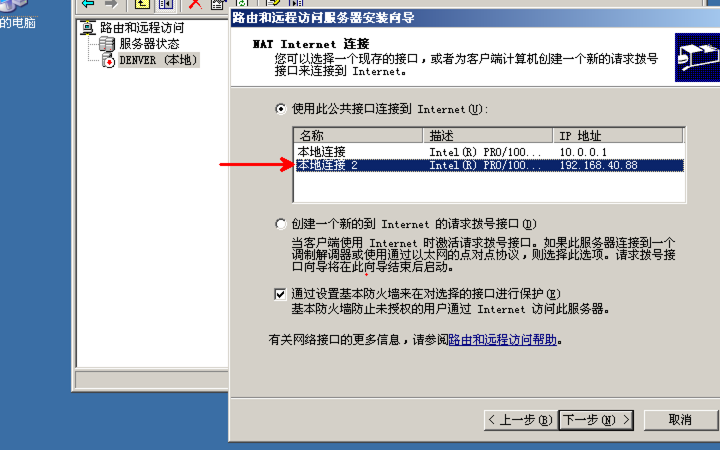 Denver:开始菜单-->管理工具-->路由和远程访问-->右击“配置并启用路由和远程访问” -->网络地址转换(NAT)