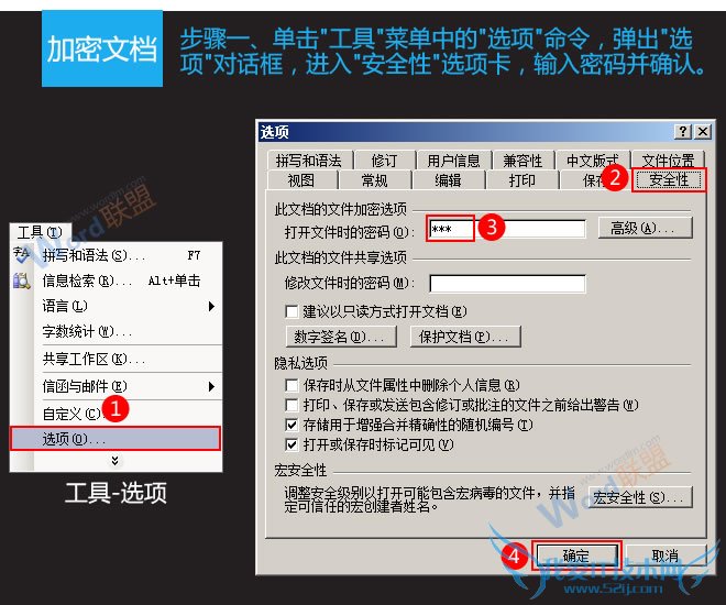 1、单击“工具”菜单中的“选项”命令,弹出“选项”对话框,进入“安全性”选项卡,输入密码并确认。