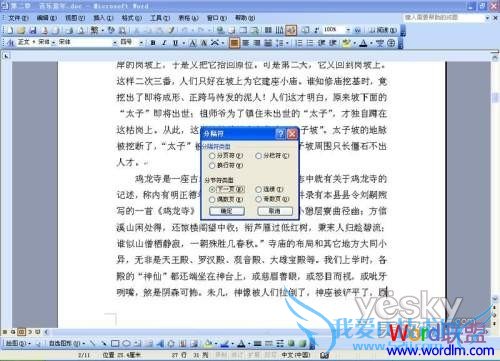 1. 将光标定位在要使用不同页眉或页脚的页的最后一行的末尾处,单击“插入/分隔符”命令,弹出“分隔符”对话框,选择“分节符”类型中的“下一页”,单击“确定”按钮(图1)。