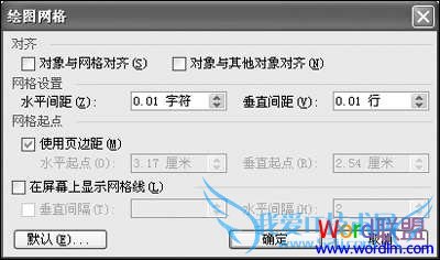 依次选择“绘图”工具栏的“绘图→绘图网格”命令(默认位于word窗口下方),在弹出的“绘图网格”界面中取消勾选“对象与网格对齐”复选框或将“水平间距”和“垂直间距”都设置为“0.01”(如图1),再单击“默认”按钮,在提示“是否更改网格线的默认设置?”时单击“是”按钮。这样以后在Word中直接拖动就可以精确调整了。