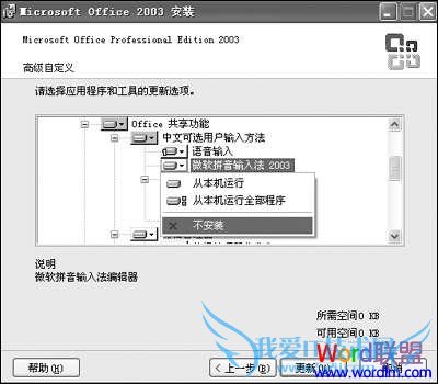 依次打开“控制面板→添加或删除程序”,从列表中找到“Microsoft office Professional Edition 2003”项并单击“更改”按钮。在Office 2003安装窗口中点选“添加或删除功能”单选项并单击下一步,接着勾选“选择应用程序的高级自定义”复选框再单击下一步,从中间的列表中依次展开“Microsoft Office→Office共享功能→中文可选用户输入法→微软拼音输入法 2003”,单击“微软拼音输入法 2003”前的按钮选择“不安装”(如图2),单击“更新”按钮。等安装完成以后再进入word时出现的就不是微软拼音输入法了,而是输入法列表中排在首位的中文输入法。最后只要让常用的输入法排在首位即可。