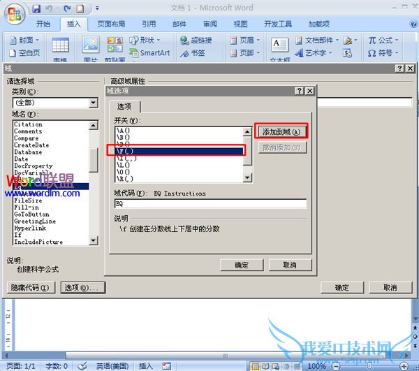2.弹出“域”对话框,在“域名”的列表框中选择“Eq”选项,单击“域代码”按钮。