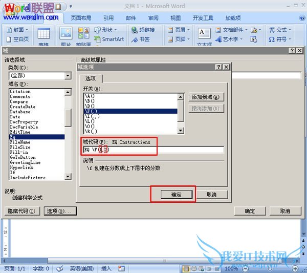 5.在“域代码”下面的文本框中已经出现了相应的代码,根据需要输入分数数字,比如要输入1/2,则在括号中相应的位置输入1、2,最后单击“确定”按钮。