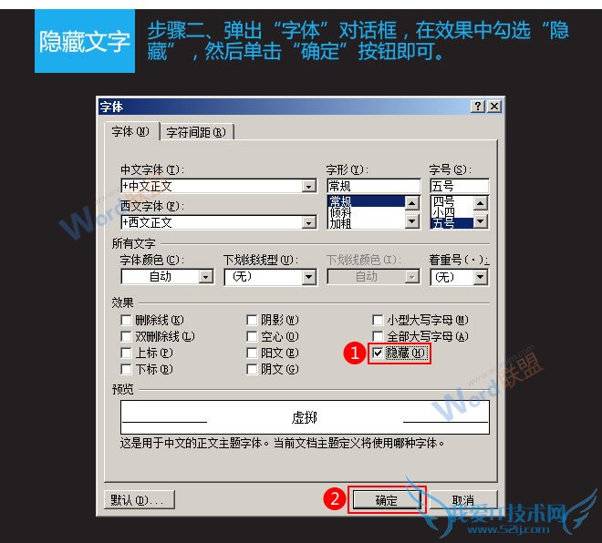2、弹出“字体”对话框,在效果中勾选“隐藏”,然后单击“确定”按钮即可。
