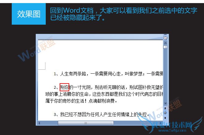 3、回到Word文档,大家可以看到我们之前选中的文字已经被隐藏起来了。