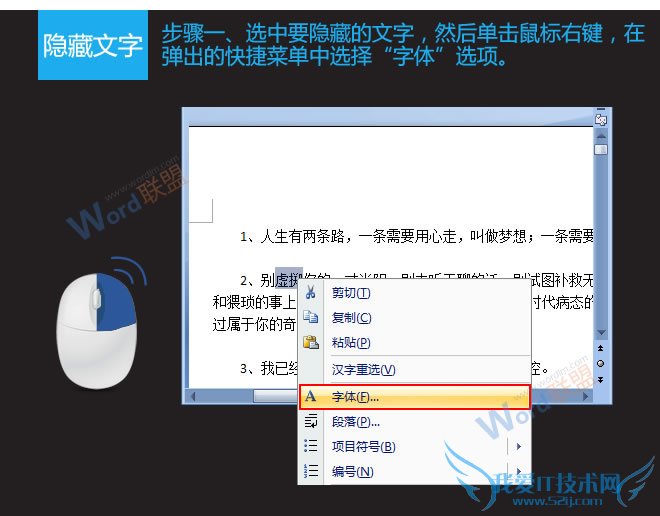 1、选中要隐藏的文字,然后单击鼠标右键,在弹出的快捷菜单中选择“字体”选项。