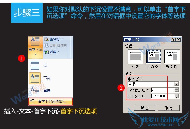 3、如果你对默认的下沉设置不满意,可以单击“首字下沉选项”命令,然后在对话框中设置它的字体等选项