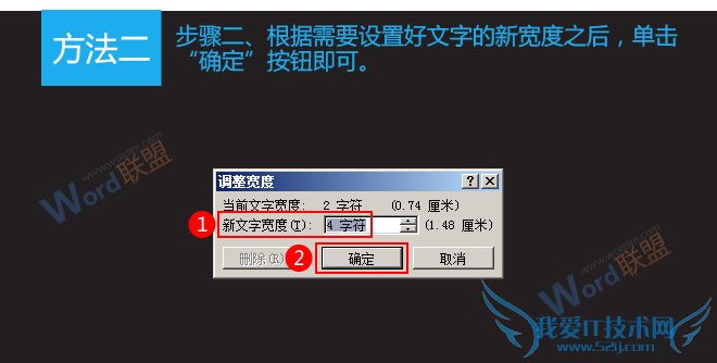 2、弹出“调整宽度”对话框,将新文字宽度设置为“4字符”。